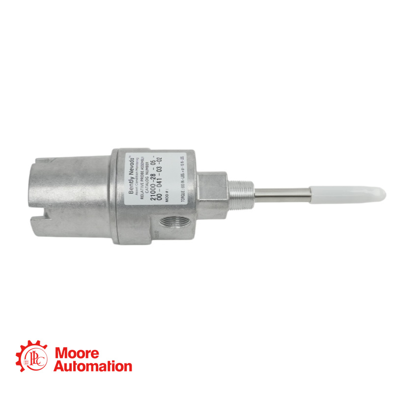This is a 21000 Proximity Probe Housing Assembly manufactured by Bently Nevada (Baker Hughes). 21000-28-05-15-050-03-02 assembly features a 1.5-inch Standoff Adapter for thermal isolation or clearance, paired with a 5.0-inch probe penetration length. The housing provides a robust, weather-tight (Type 4) enclosure suitable for hazardous area installations. The assembly includes a 3/4-14 NPT mounting thread and a comprehensive conduit fitting kit (Option 03) for field wiring termination.