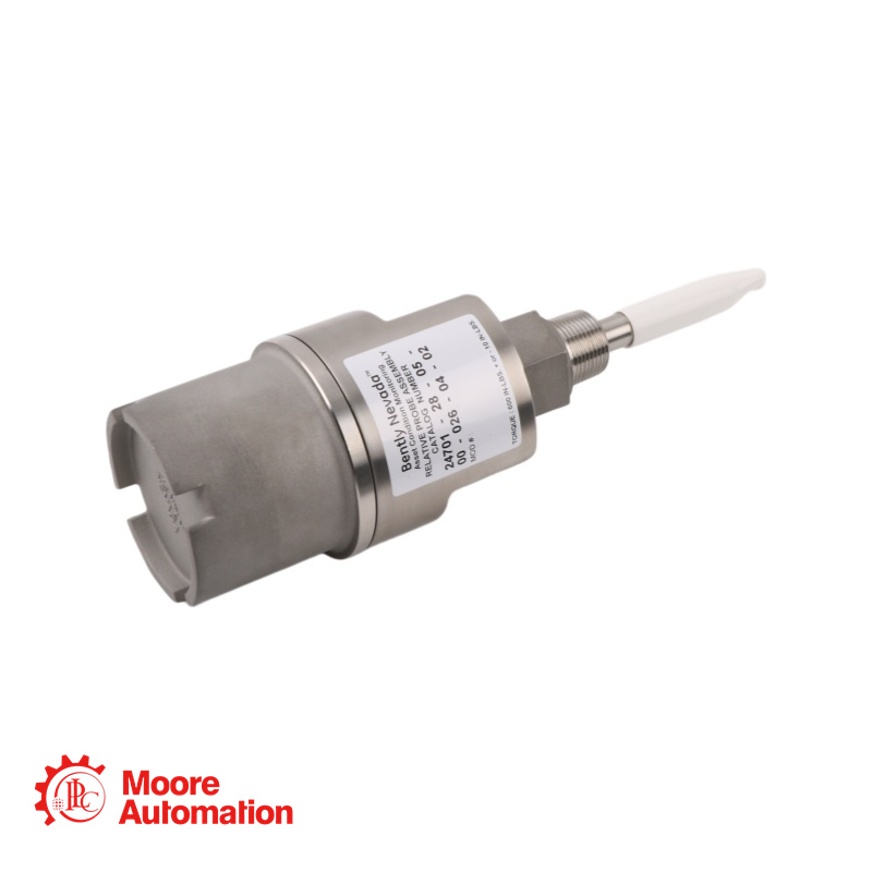 This is a 24701 Proximity Probe Housing Assembly manufactured by Bently Nevada (Baker Hughes). It is an all-metal housing constructed from 303 stainless steel body with a 304 stainless steel sleeve. It includes a pre-installed 3300 XL 8 mm proximity probe (with connector protector) and a 0.5-meter cable.