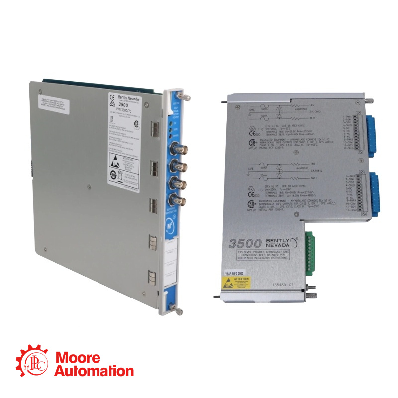 The Bently Nevada 3500/70M Recip Impulse Velocity Monitor is a 4-channel device used as part of the reciprocating compressor solutions package to monitor compressor crankcase and crosshead vibration. The monitor accepts input from seismic transducers, conditions the signal to derive vibration measurements, and compares the conditioned signals with user-programmable alarms.