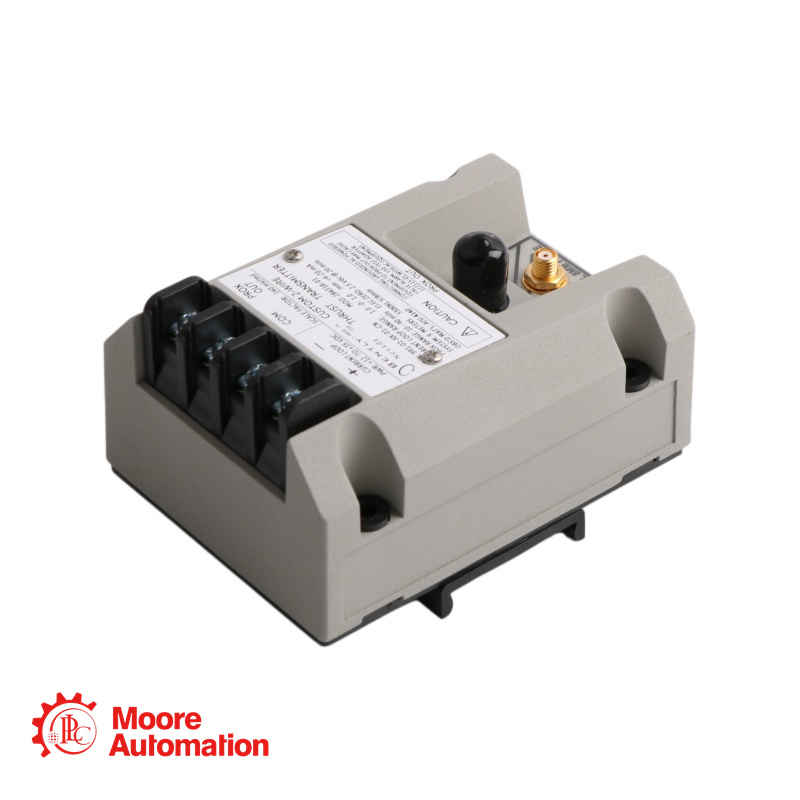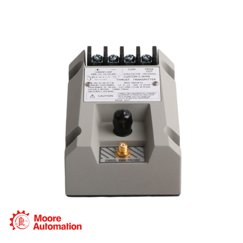 The 991-01-XX-01-CN MOD:284318-01 is a two-wire, loop-powered thrust transmitter that accepts input from a 3300 NSv proximity probe to provide a 4-20 mA signal proportional to axial displacement (thrust position).The 991-01-XX-01-CN MOD:284318-01 transmitter conditions the signal into appropriate engineering units proportional to the shaft’s axial position1, and provides it as a 4 to 20 mA industry-standard signal for input to the control system where machinery protection alarming and logic occurs.