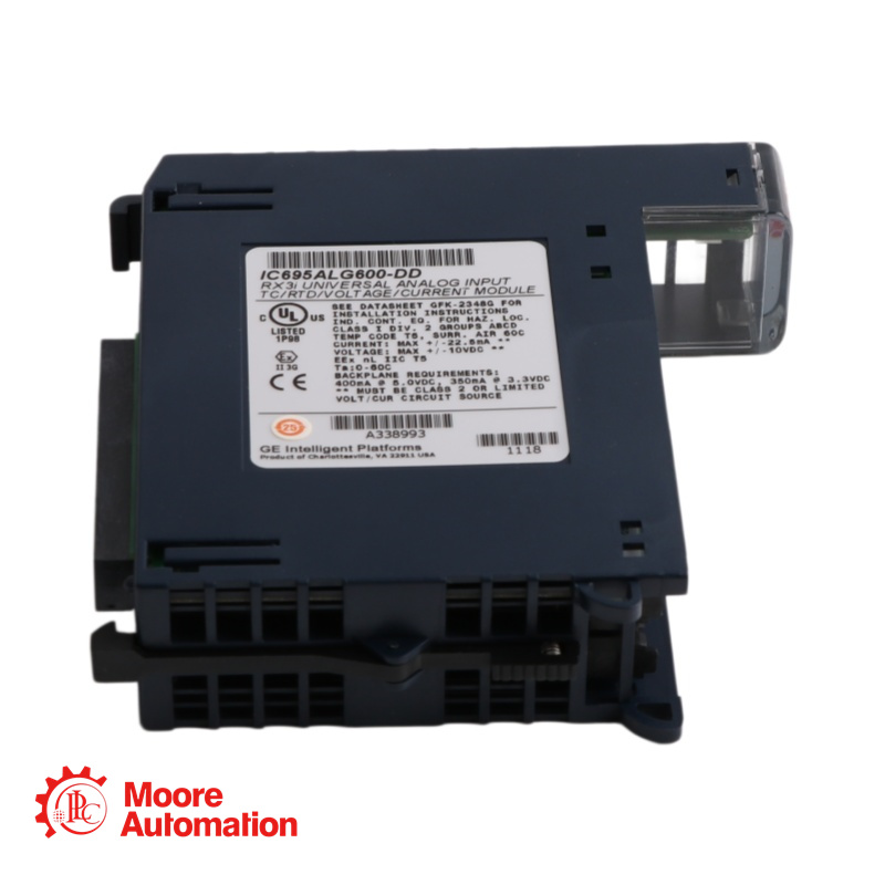 The IC695ALG600-DD is a high-performance universal analog input module for the PACSystems RX3i platform. It provides eight general-purpose input channels and two dedicated CJC channels, divided into two isolated groups of four channels each. Each channel is individually software-configurable via Proficy Machine Edition, supporting a wide range of input types including voltage, current, thermocouple, RTD, and resistance. The module features autocalibration at power-up, onboard error-checking, open-circuit and short-circuit detection, user-defined scaling, and configurable alarms (overrange, underrange, high/low alarms, rate-of-change alarms). The -DD revision specifically enhances tolerance to terminal block detection and includes firmware version 1.14, which resolves earlier issues related to CJC accuracy, open-wire RTD affecting adjacent channels, and unstable thermocouple readings on open circuits.